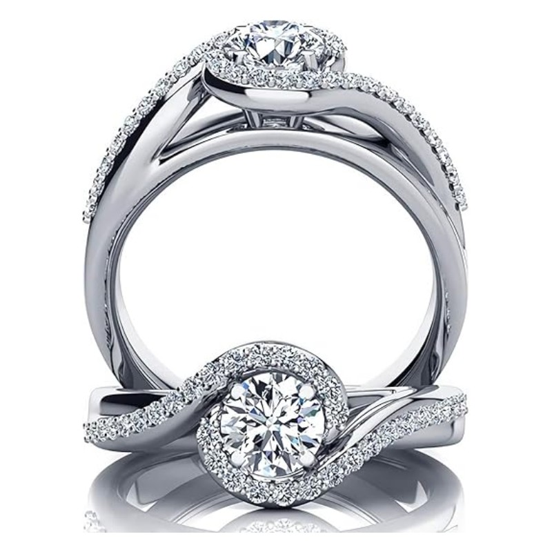 Classic round cut 1.3 ct tw halo moissanite engagement ring with elegant bypass shank. Available in 10k, 14k, or 18k white gold. Nickel-free, hypoallergenic, and free engraving for personalization. Comes in a signature gift box, perfect for engagements, weddings, anniversaries, or special occasions.